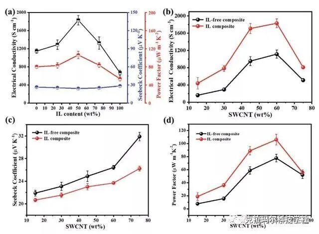 图3.IL和无IL复合材料的TE性能。a)IL复合材料(SWCNT含量为60wt%)的TE性能对IL含量的依赖关系。b-d)无IL和IL复合材料的TE性能对SWCNT含量的依赖性。IL含量与PEDOT:PSS、PVA和SWCNT的固体含量有关,因此不计入SWCNT或其他聚合物组分的固体百分比。
