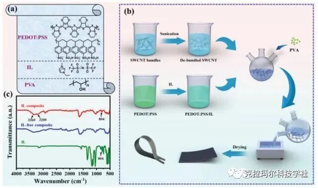 图1|柔性TE复合材料的原料、制备和红外光谱的化学结构。A)PEDOT的化学结构:PSS、IL和PVA。B)IL复合薄膜制备程序示意图。C)IL复合材料、无IL复合材料和IL的FTIR光谱。