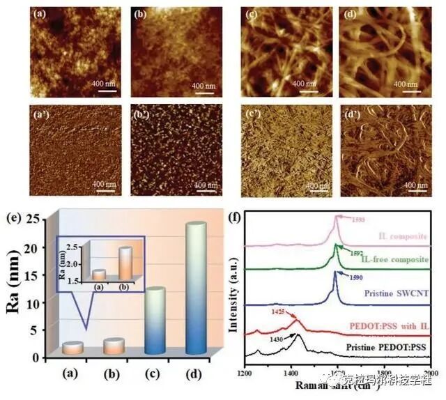 图4.原子力显微镜图像和拉曼光谱。a,a‘)原始PEDOT:PSS胶片的AFM图像。b,b‘)PEDOT:含50wt%IL的PSS微球。c,c‘)无IL复合材料。d,d‘)IL复合物。高度图像:(a-d);相位图像:(a‘-d’)。e)从每个高度图像中获得粗糙度值。f)原始PEDOT:PSS、IL含量为50wt%的PEDOT:PSS、原始SWCNT、无IL复合材料和IL复合材料的拉曼光谱。